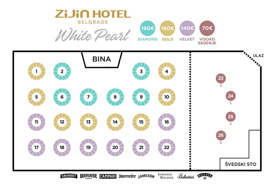 Cena po osobi se kreće od 140 eur do 180 eur u zavisnosti od pozicije stolova i uključuje večeru i neograničenu konzumaciju alkoholnih i bezalkoholnih pića tokom cele večeri. Postoje i barski stolovi sa stolicama za koje je cena 70 eur po osobi.