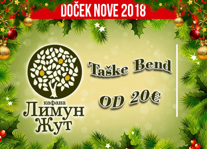 Za sve ljubitelje kafanske atmosfere kafana Limun Žut nudi specijalan program za doček Nove 2018. Godine. Nezaboravan provod uz Taške Band po ceni od 20 evra. Kompletnu ponudu dočeka Nove godine u kafani Limun Žut pogledajte ovde.