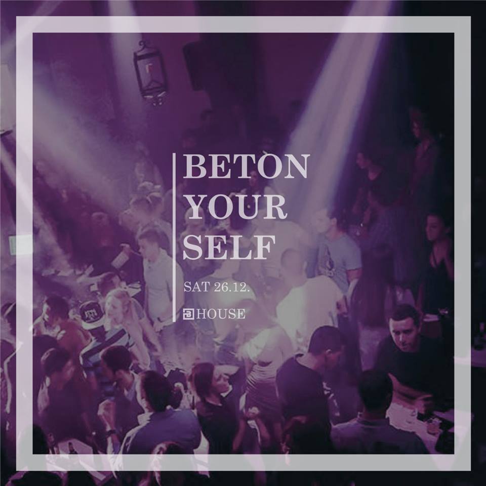 Okupljanje iskusnih urbanih clubbera i ljubitelja dobrog house zvuka je kao i uvek u jednom od najboljih klubova u gradu - Betonu! Tematsko veče pod nazivom BETON YOURSELF je veče kada će atmosfera biti van kontrole jer će za istu biti zaduženi renomirani beogradski di-džejevi poznati po sjajnim žurkama na kojima se ostaje do zore! Spremite se za sjajan provod, vidimo se večeras!
