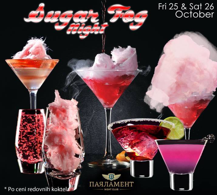 Međutim, to nije sve! Posebno za ovaj vikend: SUGAR FOG NIGHT Ljuba The King, atraktivni barmen kluba Parlament, kao prvak Srbije i četvrti u svetu po pravljenju koktela, služice Candy Cocktails, koji će gostima biti dostupni po regularnim cenama. Na meniju će takođe biti i žele šotovi, alkoholne šećerne pene i alkoholni kolači.