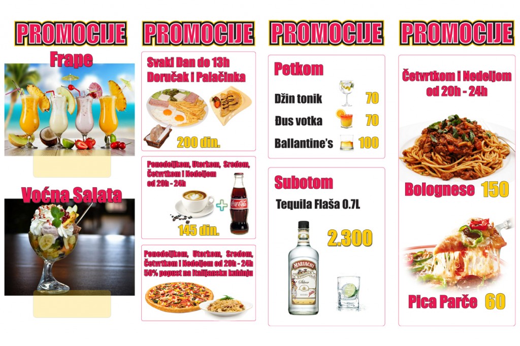 Od nedelje do četvrtka možete da računate na 50% popusta na italijansku kuhinju u periodu od 20h do 24h, kao i na kafu i koka kolu za samo 145 dinara. Tu su i promocije frapea i voćnih salata, petkom imate džin tonik - 70 dinara, đus votka - 70 dinara, Ballantine's - 100 dinara, subotom flaša tekile 0,7L - 2300 dinara, a četvrkom i nedeljom od 20h-24h: Bolognese - 150 dinara, parče pice - 60 dinara.
