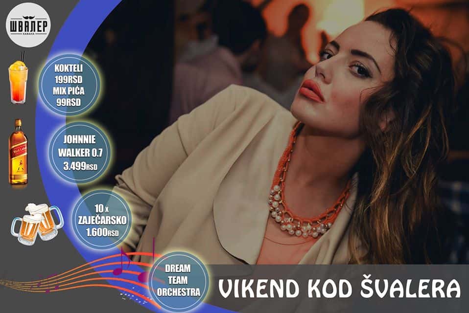 Savetujemo vam da rezervišete svoje mesto na vreme pozivom na brojeve telefona: 063 33 33 44 ili 063 34 34 33 kao i OnlineRezervacije su besplatne, ali obavezne.  Kafana Švaler priređuje sjajnu zabavu u petak i subotu, pored muzike vrunskog kvaliteta i sjajne atmosfere za koju će biti zadužen Dream Team Orchestra, tu je  i CELOVEČERNJA AKCIJA za petak 15.11. za kafanu Švaler: akcija - kokteli 199rsd, mix pića 99rsd, uz brojne promocije (Johnnie Walker 0.7 / Keglevich vodka 0.7 - 3.499rsd, 10xZaječarsko pivo - 1600rsd), kao i za subotu 16.11.  akcija - Johnnie Walker 0.7 / Keglevich vodka 0.7 - 3.499rsd, Jameson 0.7 - 4.900rsd, 10xHeineken - 2500rsd. Rezervišite svoje mesto na vreme! Rezervacije su besplatne, ali obavezne. Ukoliko nas budete redovno pratili uvek ćete prvi saznati sve najbitnije informacije vezane za noćni život Beograda.