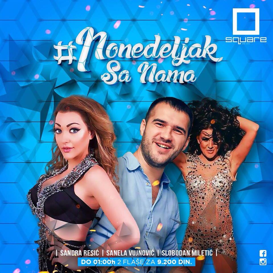 Navikli smo da se u klubu Square nezaboravno provodimo svakog vikenda, ali ovoga puta popularni prestonički klub odlučio je da vas iznenadi vrhunskom žurkom za sam početak radne nedelje! Sjajna ekipa muzičara okupiće se ovog ponedeljka u Square-u i prirediti vam noć za pamćenje! U pitanju su Sandra Resić, Sanela Vujnović i Slobodan Miletić! Uz to, očekuje vas i fantastična promocija koju je Square pripremio za vas, a ona obuhvata dve flaše po izboru (Absolut vodka, Balantines, Jager ili Gin) za samo 9200 rsd! Akcija traje do 01h, zato iskoristite ovu odličnu priliku za najluđi provod! Vidimo se ovog ponedeljka!